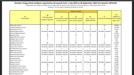 Latest figures from the Office of Local Government show the Central Coast has slipped to fifth place for the number of dog attacks in the first quarter of 2025-26.